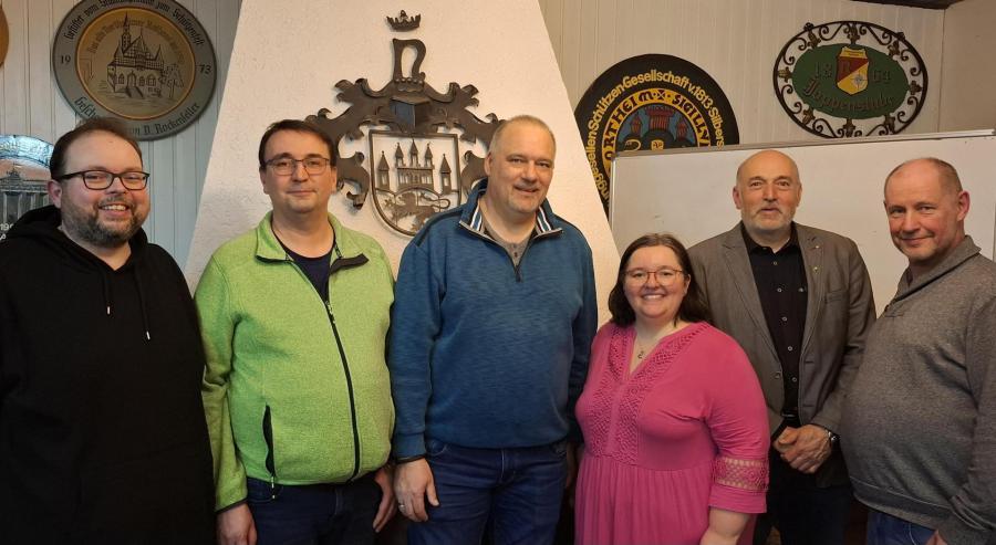 Auf dem Bild von links nach rechts: Vizepräsident Verwaltung Tobias Meinshausen, Schützenleutnant Jan Friedrich, Präsident Rouven Goldberg, Vizepräsidentin Finanzen Jennifer Heine, Schießsportleiter Dietmar Denecke und Liegenschaftswart Dirk Wittkewitz.